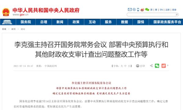 7月14日,国务院总理李克强主持召开国务院常务会议,部署中央预算执行和其他财政收支审计查出问题整改工作;确定完善农村寄递物流体系的措施,更好满足农民生产生活需要。