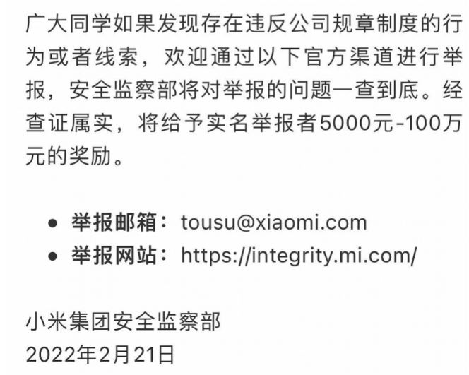 小米通报去年全年139起违规违纪案件,受贿、职务侵占高发小米通报去年全年139起违规违纪案件,受贿、职务侵占高发